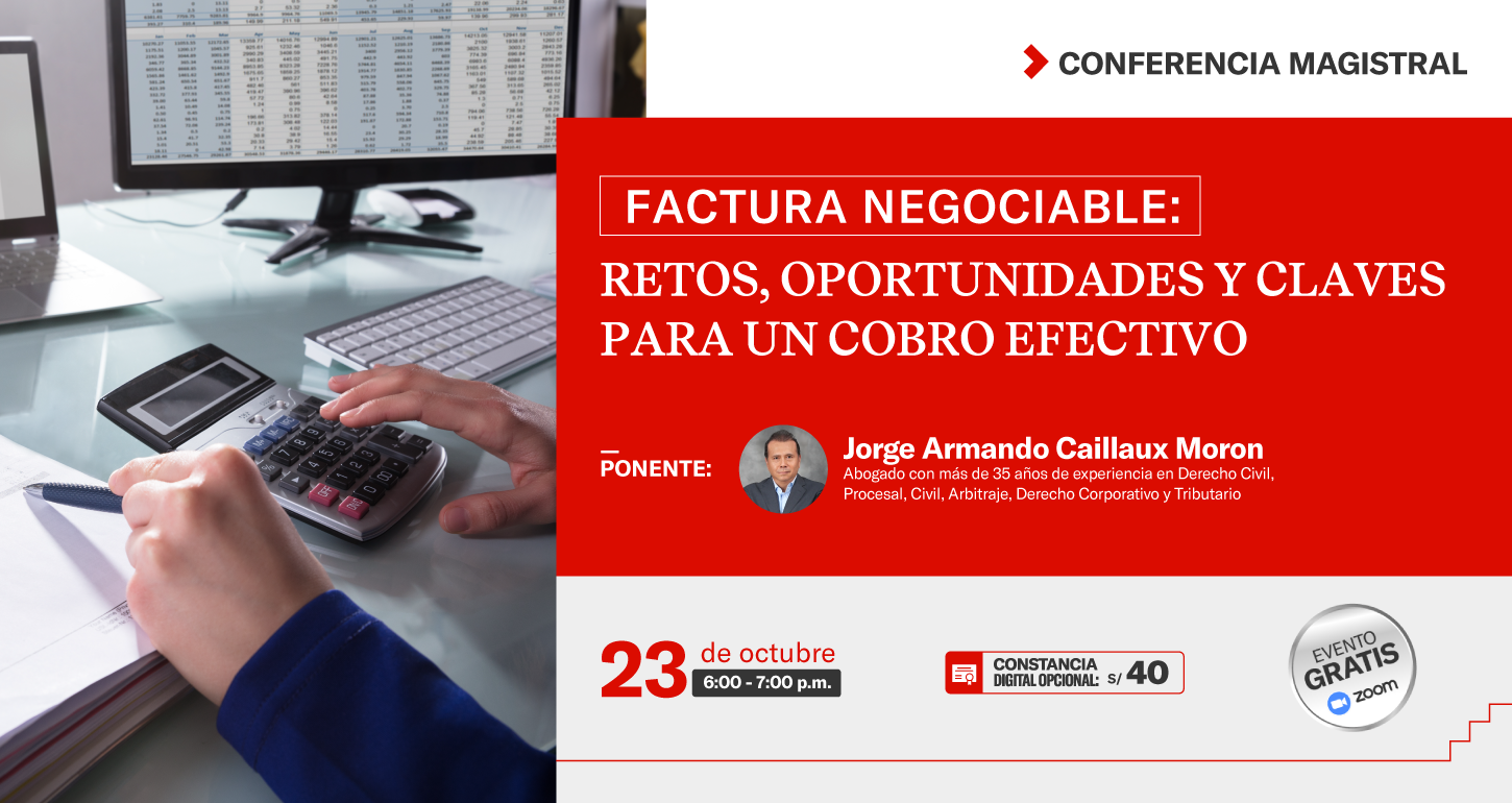23 octubre - 6:00 pm - 7:00 pm FACTURA NEGOCIABLE: RETOS, OPORTUNIDADES Y CLAVES PARA UN COBRO EFECTIVO TEMARIO: INSCRIPCIONES: